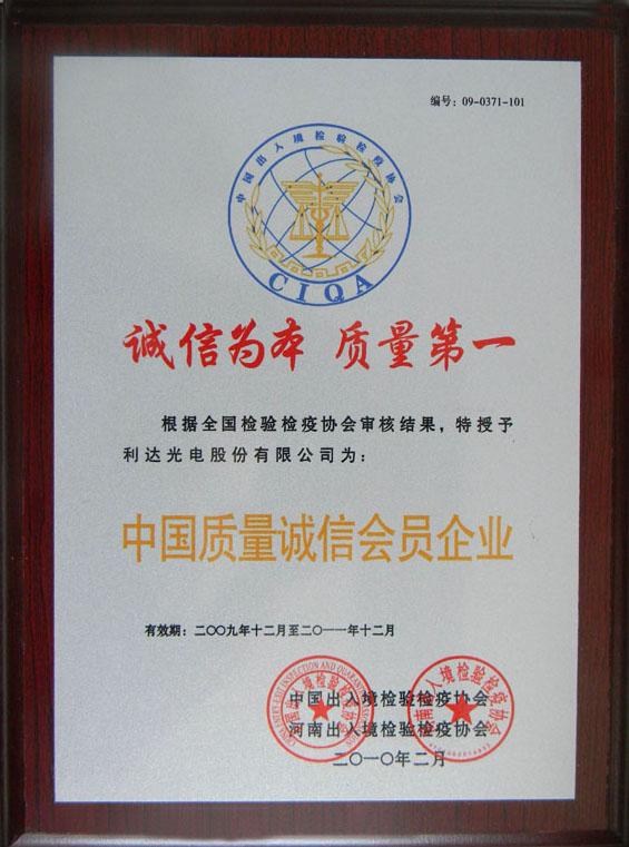 利達(dá)光電股份有限公司榮獲首批“中國(guó)質(zhì)量誠(chéng)信會(huì)員企業(yè)”榮譽(yù)稱號(hào)