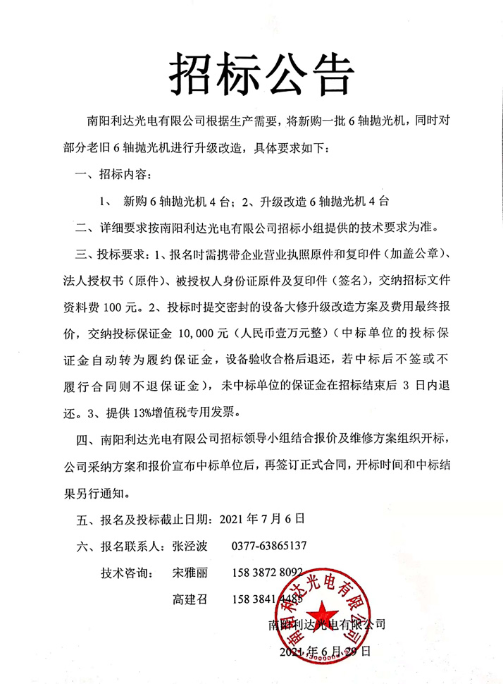 棱鏡事業(yè)部新購及升級改造6軸拋光機(jī)招標(biāo)